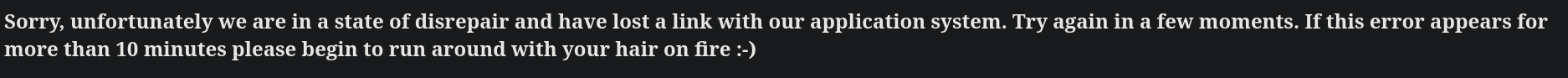 Sorry, unfortunately we are in a state of disrepair and have lost a link with our application system. Try again in a few moments. If this error appears for more than 10 minutes please begin to run around with your hair on fire :-)