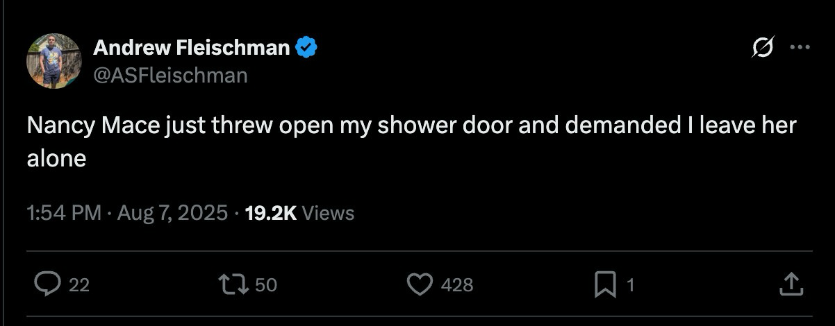 A Tweet that reads: Nancy Mace just threw open the door of my shower and demanded that I stop bothering her.