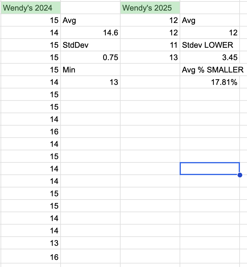 a view of a spreadsheet looking at wendy's nuggets weighed in grams between 2024 and 2025. In a sample size of 4 nuggets in 2025 all pieces were at the min size recorded in 2024 (of 20) with an average THREE POINT FOUR FIVE STANDARD DEVIATIONS SMALLER so with stupid high confidence that we have 17% SHRINKFLATION