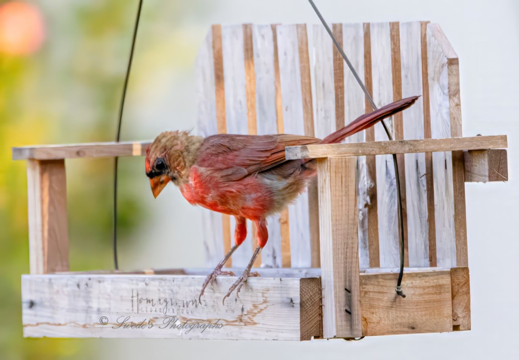 "A fledgling northern cardinal perches delicately on a miniature porch swing that doubles as a bird feeder. The swing is crafted from warm-toned wood, shaped like a tiny bench with slatted back and seat, suspended by two slender black cords that dangle from above like the ropes of a child’s swing set. The young cardinal’s plumage is a soft, mottled blend of cinnamon brown and muted red—its chest and tail tinged with a brighter, more confident crimson, hinting at the adult brilliance to come. Its posture is relaxed yet alert, tiny claws gripping the edge of the swing as if testing its balance. The bird’s crest is slightly tousled, giving it a scrappy charm, and its dark eyes seem to scan the surroundings with quiet curiosity. Behind the swing, the background melts into a dreamy blur of greens and pale hues—suggesting a sunlit garden or wooded yard, alive with summer warmth. Etched into the wooden backrest of the swing are the words “Homegrown” and “Swede’s Photographs,” adding a personal, handcrafted touch to the scene. The overall mood is whimsical and serene—a moment where nature meets artistry, and a young bird finds a perch that feels like home." - Copilot