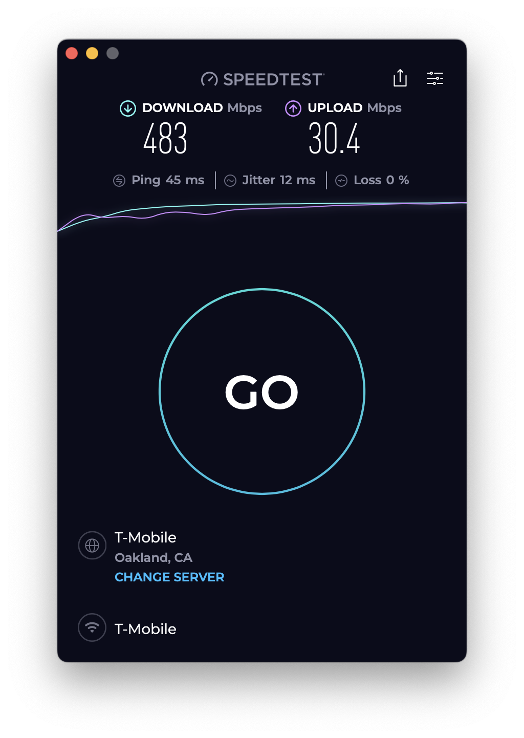 Speedtest showing 483 megabits (60 megabytes) per second download and 30 megabits (less than 4 megabytes) per second upload speeds. Itβs not symmetric, but it is $50 a month.