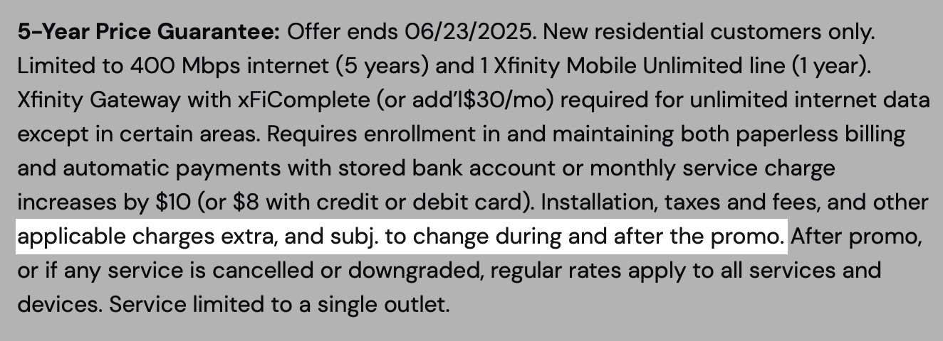 5-Year Price Guarantee: Offer ends 06/23/2025. New residential customers only. Limited to 400 Mbps internet (5 years) and 1 Xfinity Mobile Unlimited line (1 year). Xfinity Gateway with xFiComplete (or add’l$30/mo) required for unlimited internet data except in certain areas. Requires enrollment in and maintaining both paperless billing and automatic payments with stored bank account or monthly service charge increases by $10 (or $8 with credit or debit card). Installation, TAXES AND FEES, AND OTHER APPLICABLE CHARGES EXTRA, AND SUBJ. TO CHANGE DURING AND AFTER THE PROMO (emphasis mine). After promo, or if any service is cancelled or downgraded, regular rates apply to all services and devices. Service limited to a single outlet.