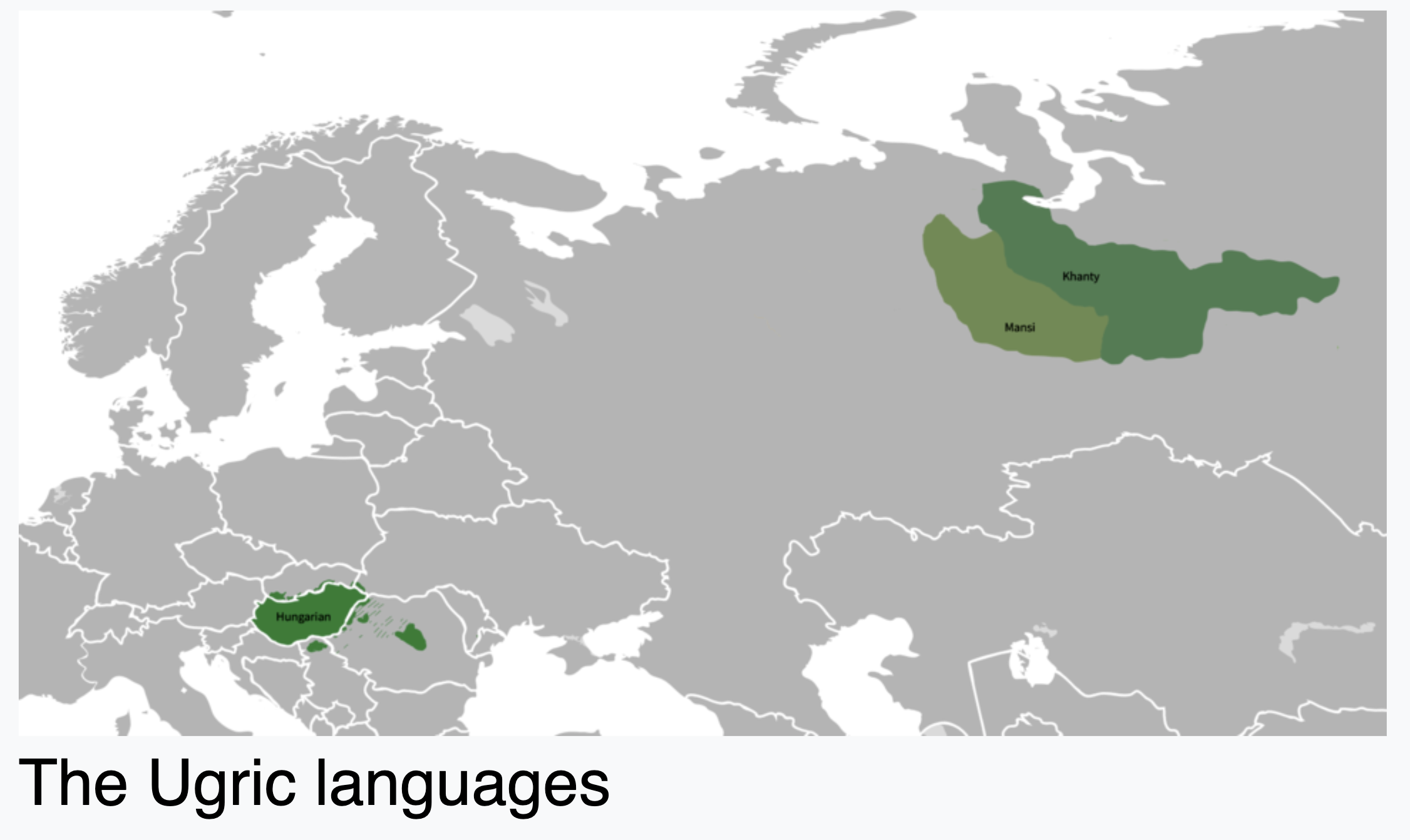 map of "The Ugric languages", with Hungary filled in and then, extremely far away, a massive patch of fuckoff Siberia also filled in