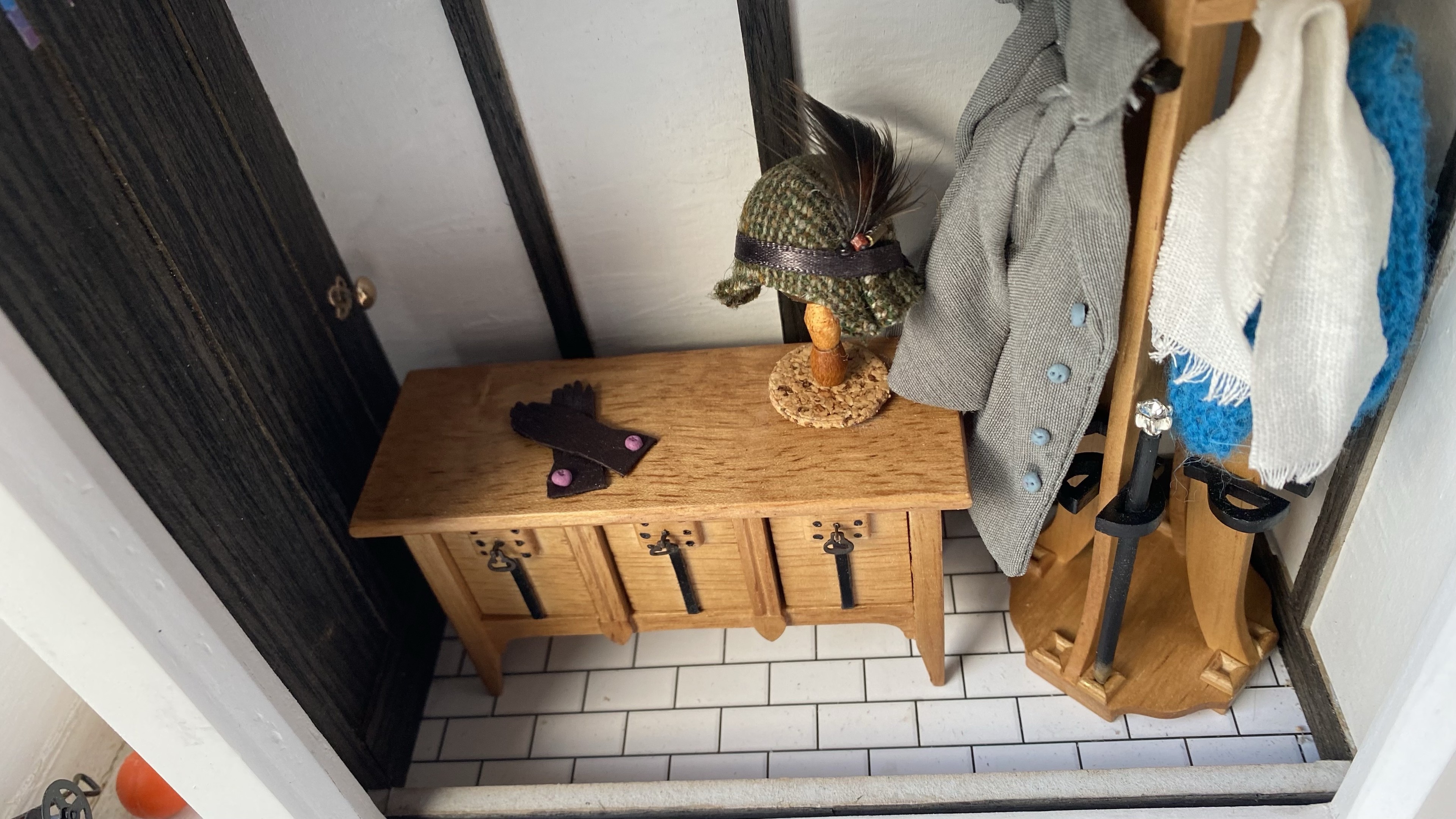 The same miniature hallway scene from above, with a wooden bench, a hat on a stand, gloves, a walking cane, a coat white scarf and blue shawl.