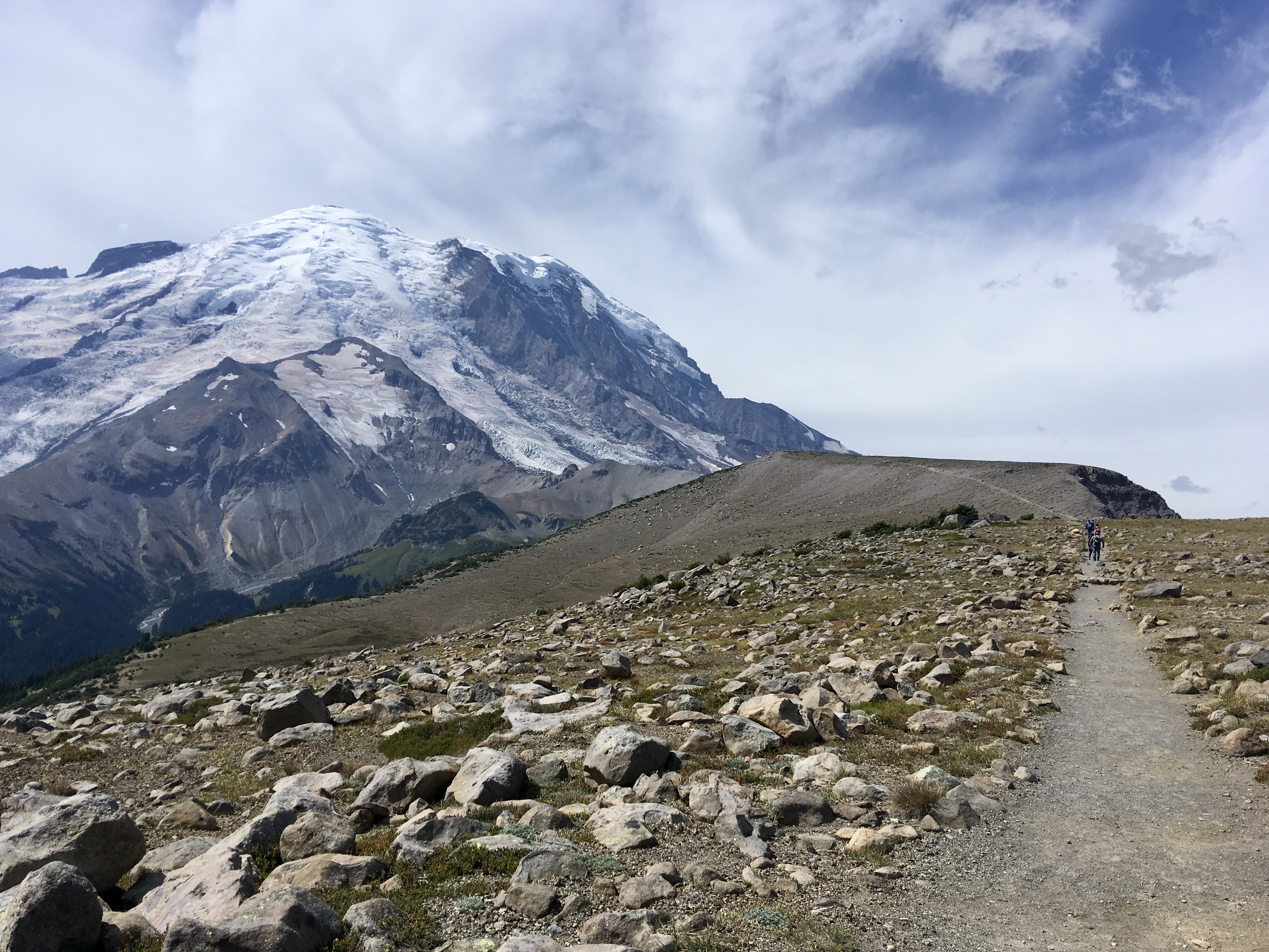 A glacier domed volcanic mountain with black underparts and wisps of copper divots loomos above a rock strewn plateau with a wide, flat path heading towards a tilted flat peak.