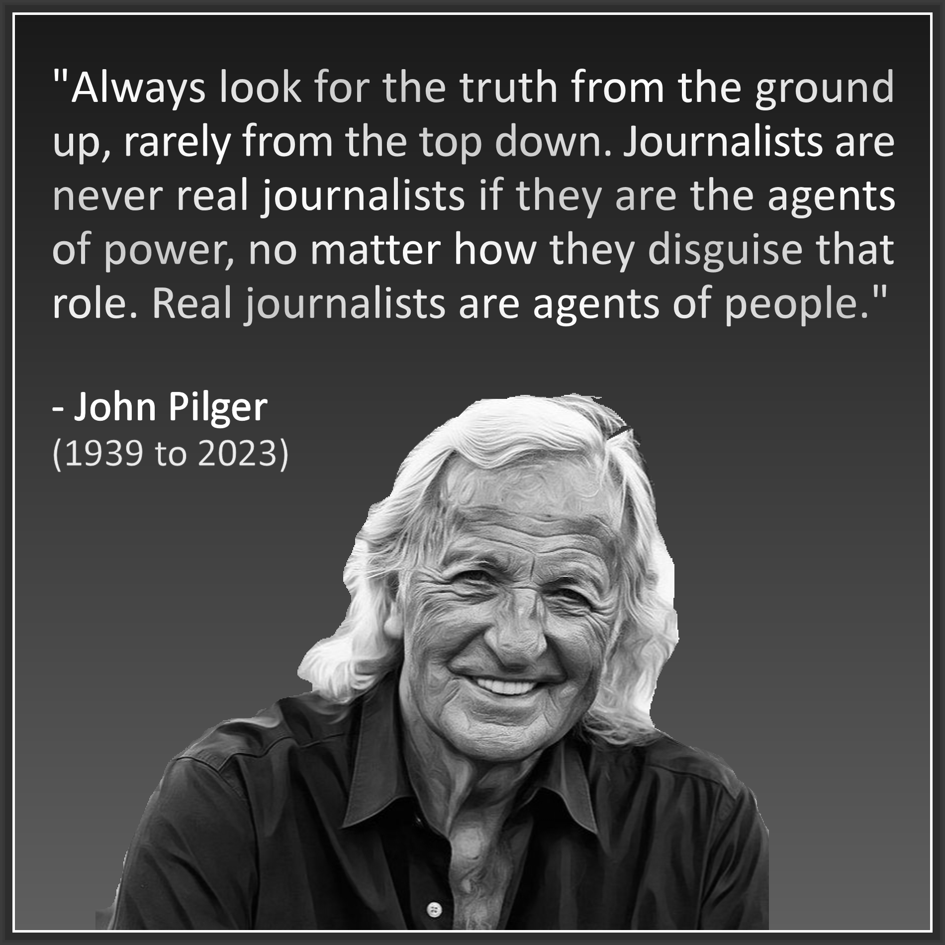 "Always look for the truth from the ground up, rarely from the top down. Journalists are never real journalists if they are the agents of power, no matter how they disguise that role. Real journalists are agents of people." . - John Pilger (1939 to 2023)