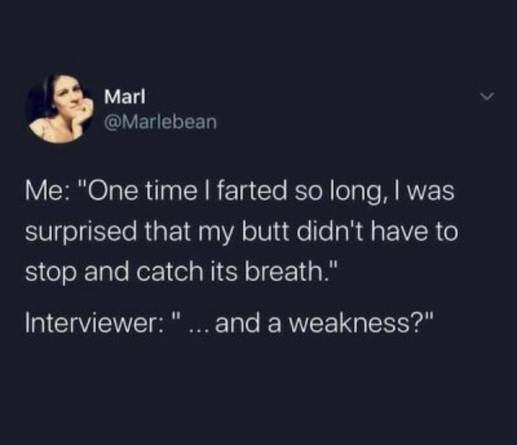 Marl @Marlebean Me: "One time | farted so long, | was surprised that my butt didn't have to stop and catch its breath." Interviewer: " ... and a weakness?"