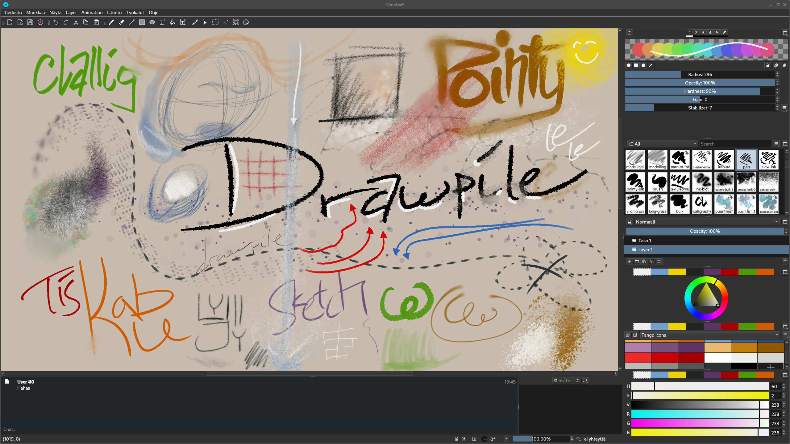 Töherrys näytteeksi eri sivelmistä. Käytössä oli piirtolevy.