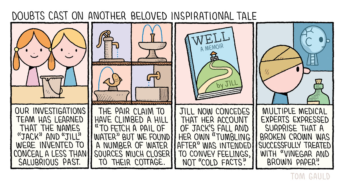 Title: Doubts cast on another beloved inspirational tale Panel 1 Our investigations team has learned that the names "Jack" and "Jill" were invented to conceal a less than salubrious past. (image of smiling Jack and Jill with a bucket) Panel 2 The pair claim to have climbed a hill to "fetch a pail of water" but we found a number of water sources much closer to their cottage. (image of a water pump, atwo fountains and a drinking trough) Panel 3 (image of a book with the title "WELL: a memoir" by Jill) Jill now concedes that her account of Jack's fall and her own "Tumbling After" was intended to convey feelings, not "Cold facts". Panel 4 Multiple medical experts expressed Surprise that a broken crown was successfully treated with "Vinegar and brown paper. (Image of Jack with is head wrapped in brown paper beside an xray of his damaged skull).