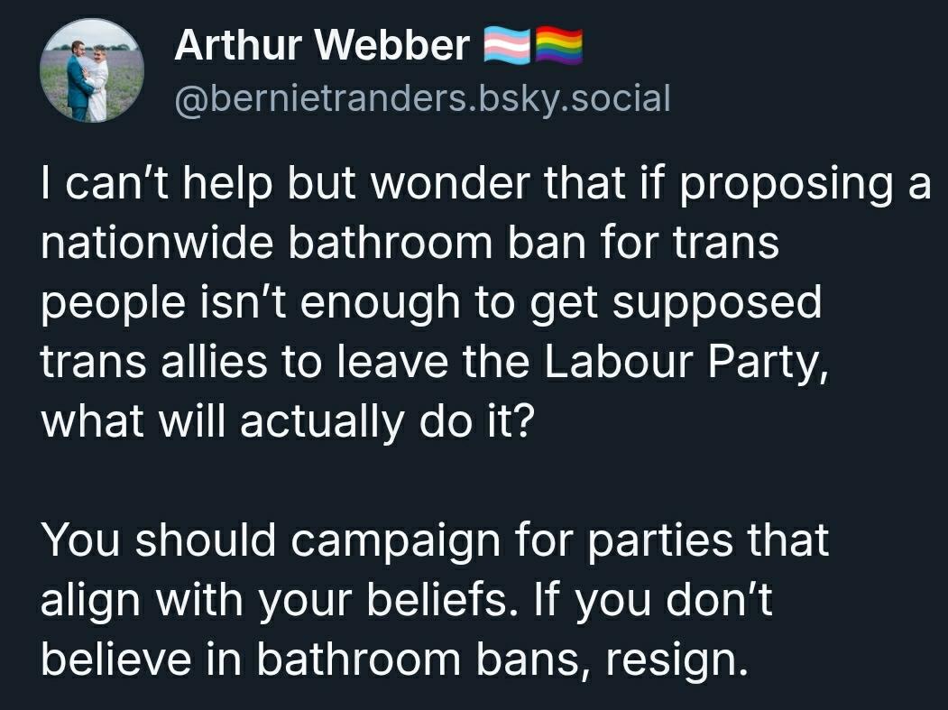 Arthur Webber on Bsky/ I canβt help but wonder that if proposing a nationwide bathroom ban for trans people isnβt enough to get supposed trans allies to leave the Labour Party, what will actually do it? You should campaign for parties that align with your beliefs. If you donβt believe in bathroom bans, resign.