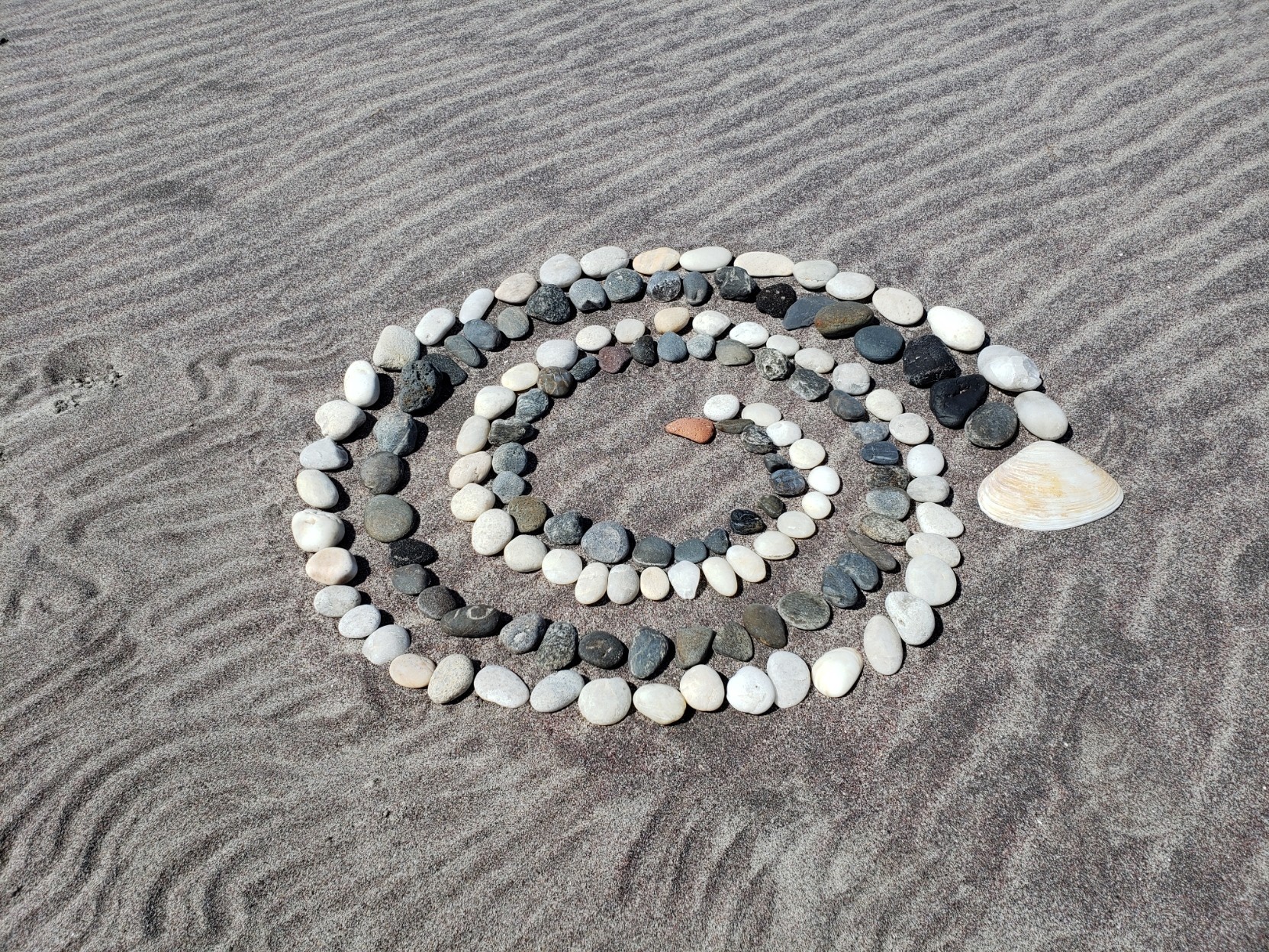 A spiral made of graduated size light and dark stones, starting at a orange-red stone and spiralling to a clamshell. It's on top of dark red sand (garnet) with wind and finger-raked ripples.