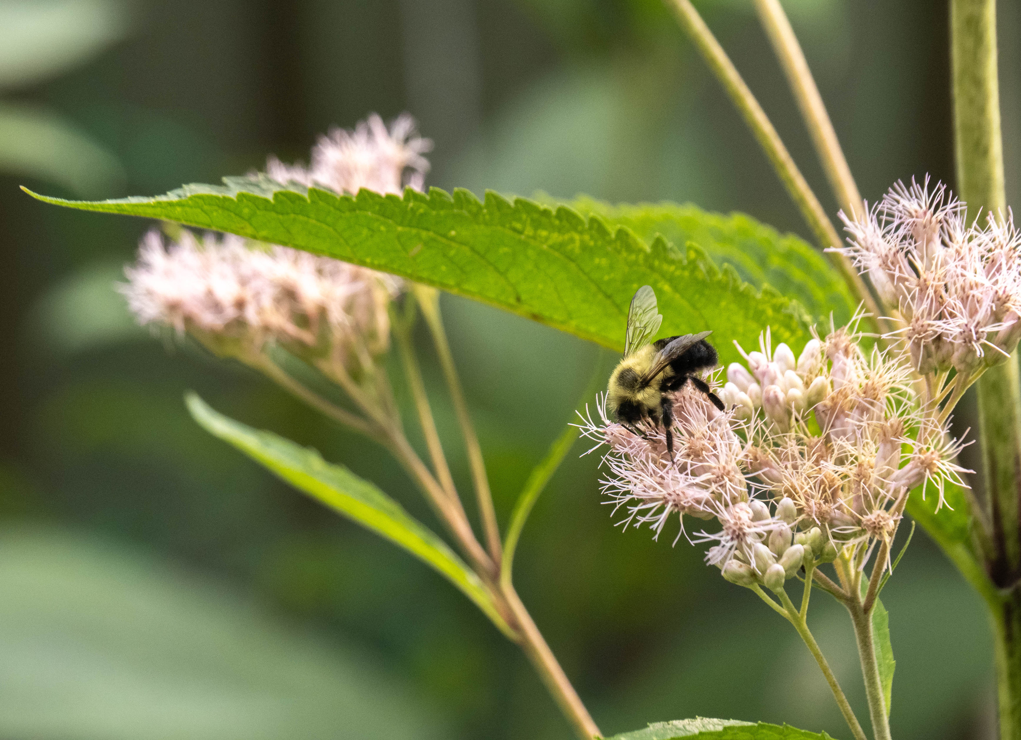A big bumblebee on a cluster of frilly pale pink blooms. Behind them is a long green leave and more blooms