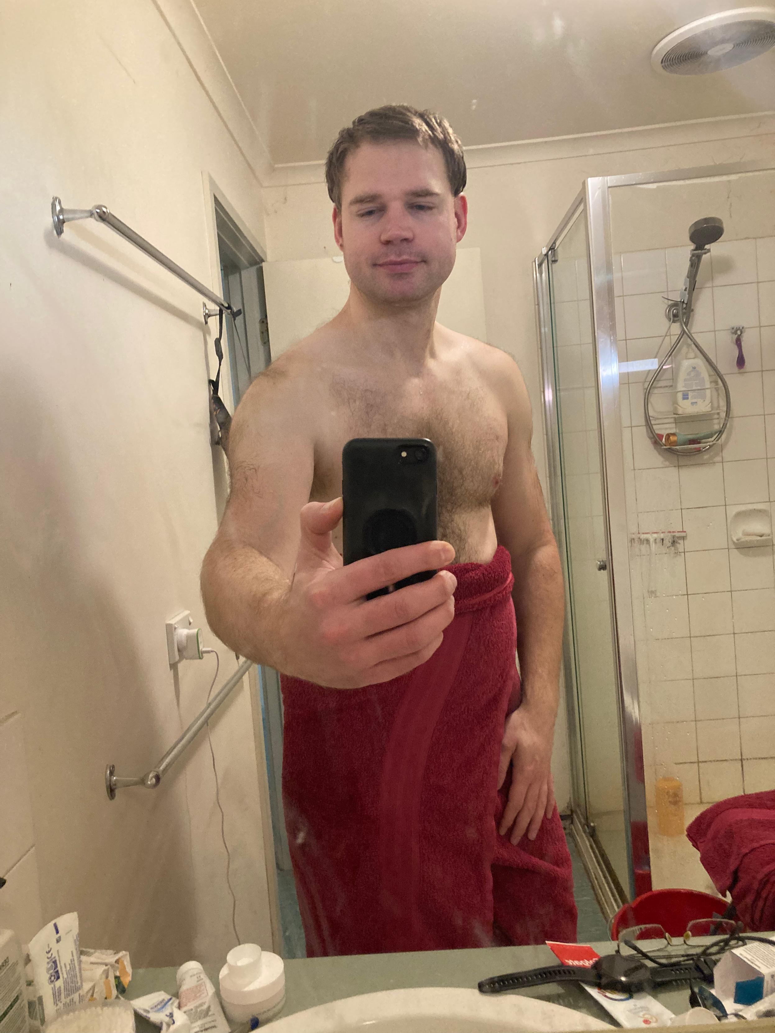 post-shower bathroom selfie of Luke. They are smiling at the camera and showing off their chest. They are wearing a red bath towel around their waist.