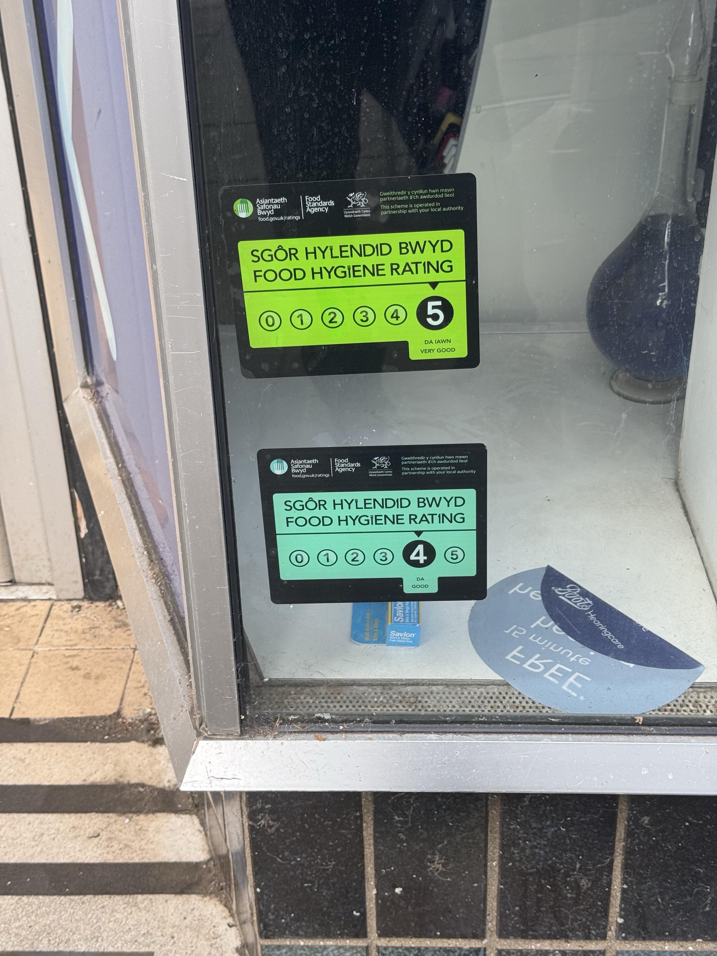 A window displaying two food hygiene rating stickers. The top sticker shows a rating of 5 (very good), while the bottom sticker shows a rating of 4 (good). Both are in Welsh and English.