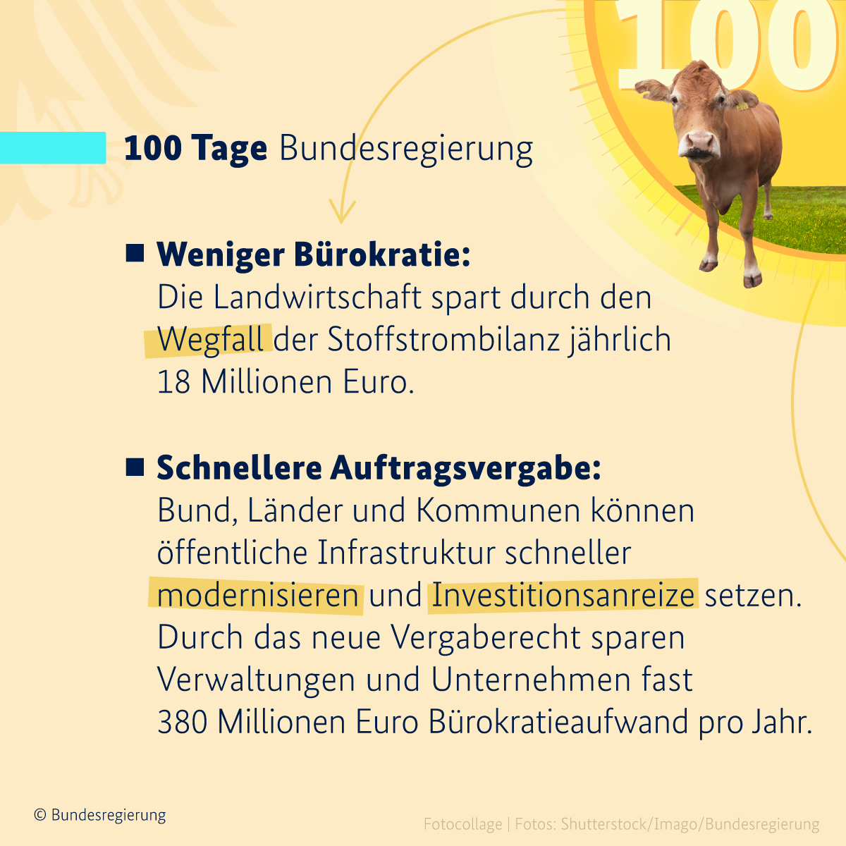 Auf hellgelbem Hintergrund ist in der oberen linken Bildhälfte ein türkisfarbener Balken zu sehen, daneben in schwarzen Buchstaben die Überschrift 100 Tage Bundesregierung. Darunter steht der Text: Weniger Bürokratie: Die Landwirtschaft spart durch den Wegfall der Stoffstrombilanz jährlich 18 Millionen Euro. Schnellere Vergabe öffentlicher Aufträge: Bund, Länder und Kommunen können öffentliche Infrastruktur schneller modernisieren und Investitionsanreize setzen. Durch das neue Vergaberecht sparen Verwaltungen und Unternehmen fast 380 Millionen Euro Bürokratieaufwand pro Jahr. Rechts oben ist eine Kuh zu sehen.