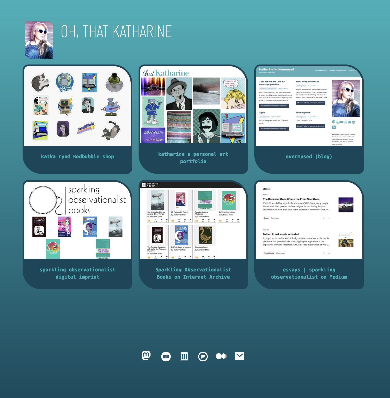 screenshot of website for "Oh, that Katharine" contains avatar of Katharine and thumbnail images of the links. top row: assorted digital art on products at Katka Rynd Redbubble store, thumbnails of graphics for that Katharine's portfolio site, screenshot of Overmused blog, bottom row: book cover thumbnails and logo for Sparkling Observationalist Books site, Sparkling Observationalist book covers on Internet Archive, Sparkling Observationalist essays on Medium.