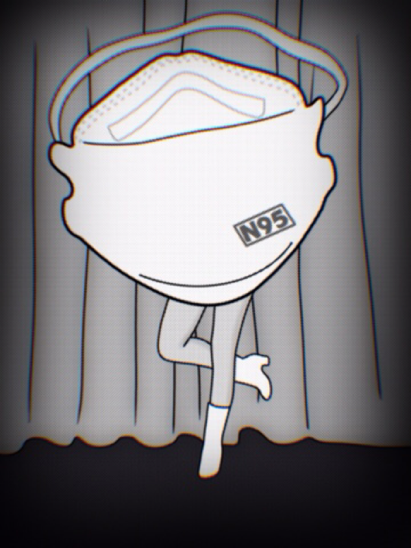 black and white illustration of a giant N95 mask with human legs dancing in front of a pleated curtain