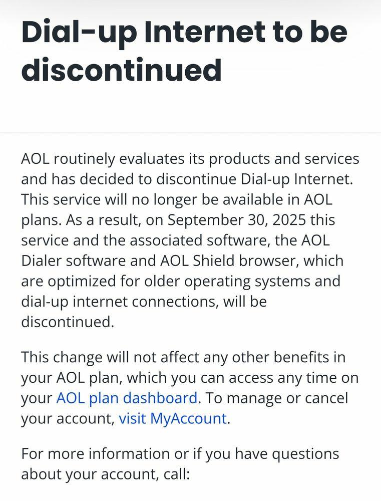 Dial-up Internet to be discontinued AOL routinely evaluates its products and services and has decided to discontinue Dial-up Internet. This service will no longer be available in AOL plans. As a result, on September 30, 2025 this service and the associated software, the AOL Dialer software and AOL Shield browser, which are optimized for older operating systems and dial-up internet connections, will be discontinued.