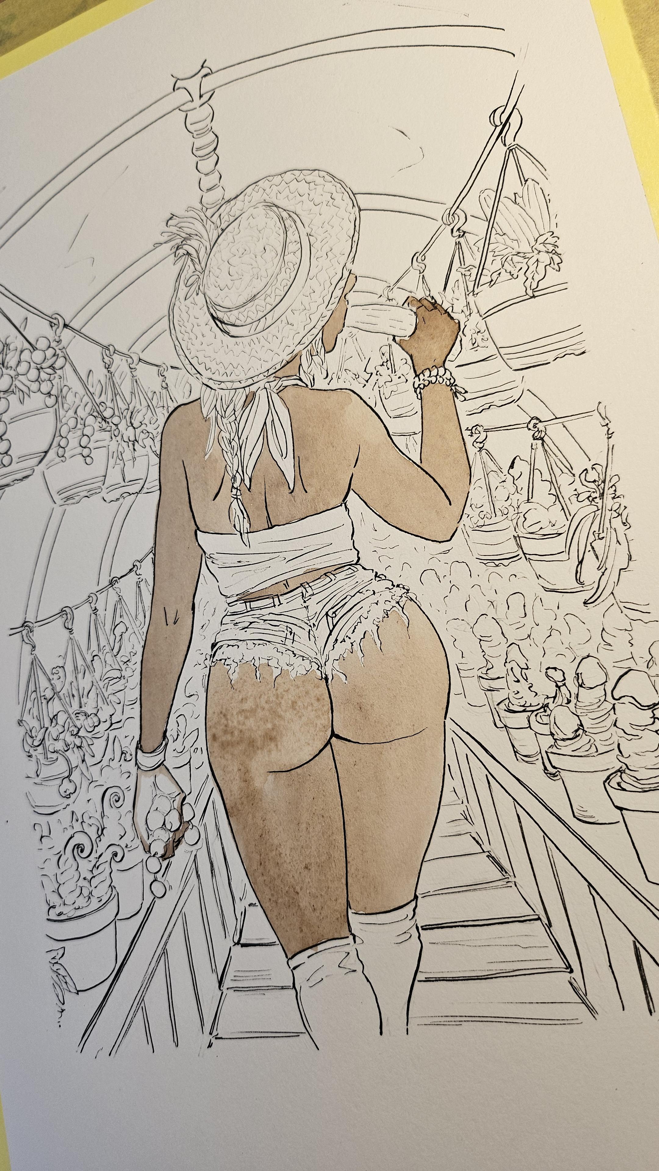 The beginning painting stages of a woman sampling her own vegetables in a totally not sexual way - she just really enjoys gerkins