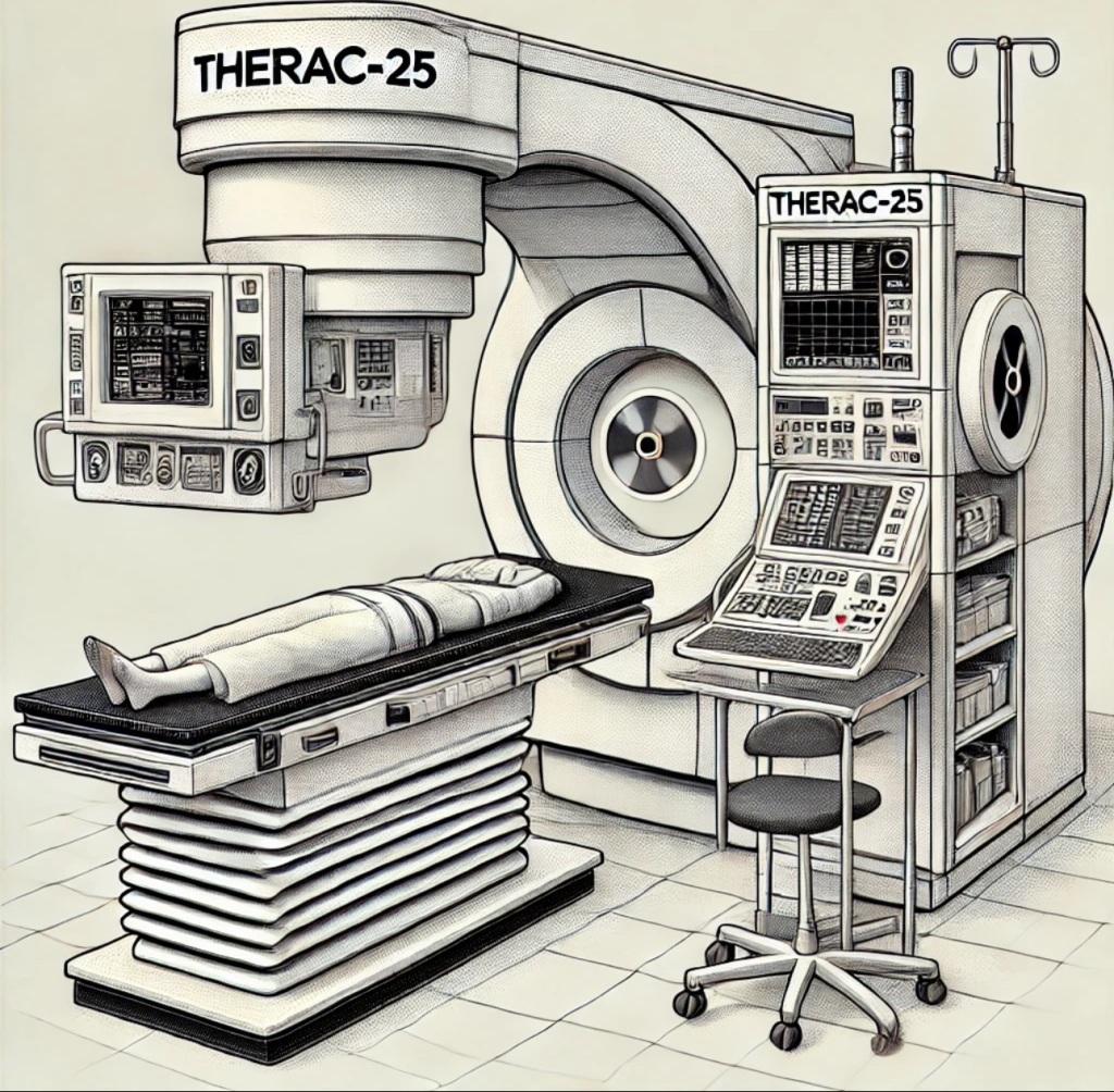 A vibe-drawn line image of the Therac-25 radiation treatment device. At a glance it looks like a person might be in the machine, but they have only one foot, and their your torso looks like it's been replaced with a hand? This is the stuff of my nightmares.