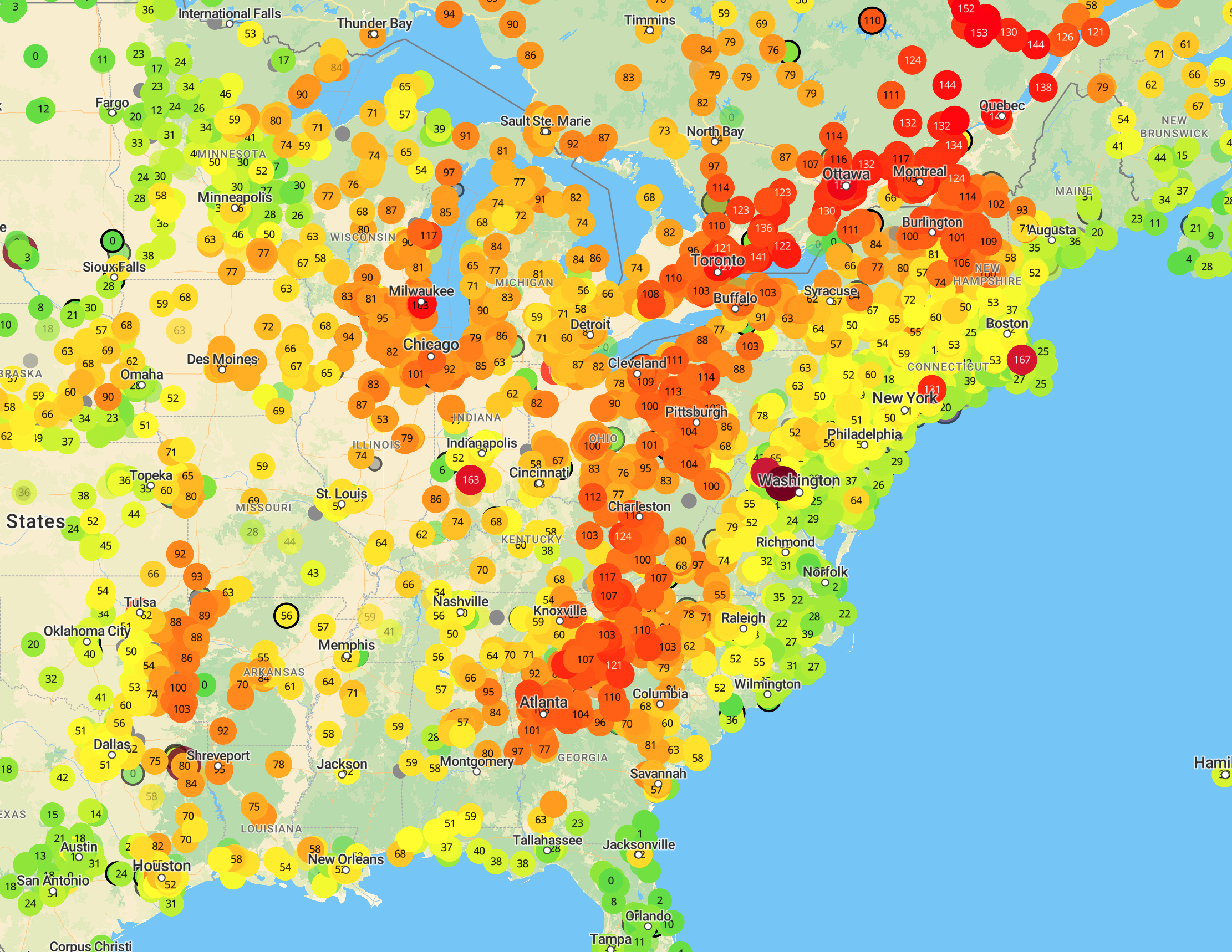 Screencap from PurpleAir showing circles representing outdoor air quality in much of the US and Canada. For my region, the bad stuff has shifted west (over us) so we are now in the red/orange sections, while the coast is more green/yellow. Some of the readings this morning in Asheville are 102 and 113. My PWS is not happy. My poor air detector (my head) is reporting the same thing.