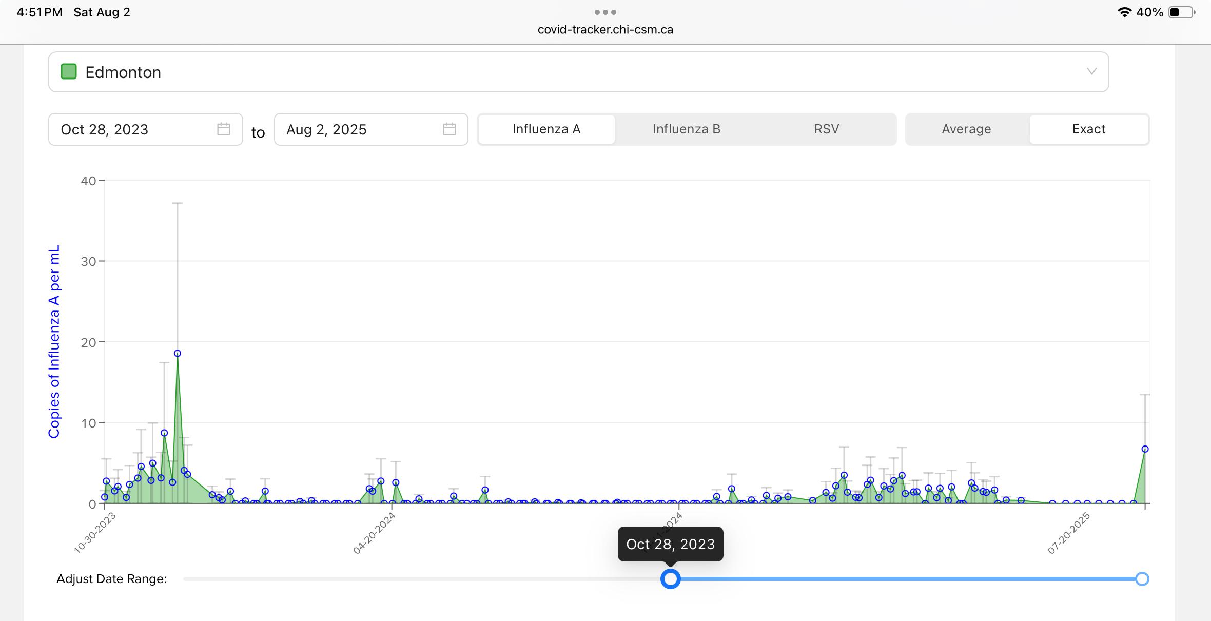 Wastewater levels for Edmonton from Oct 2023 to now (Aug 1) There is a strong spike through fall 2023 into 2024, then levels are lower, with a relatively mild flu season last year. After a month of literally zero,, the last data point on July 20 is suddenly very high.
