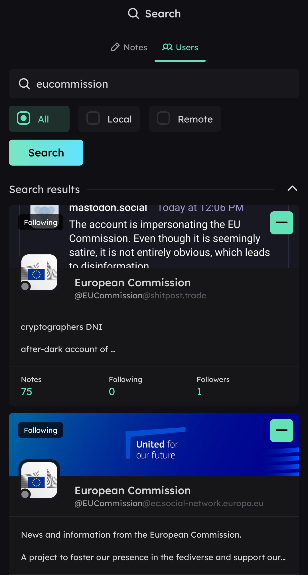 Searching for "eucommission" and the results are, in order: @EUCommission@shitpost.trade @EUCommission@ec.social-network.europa.eu I'm following both.
