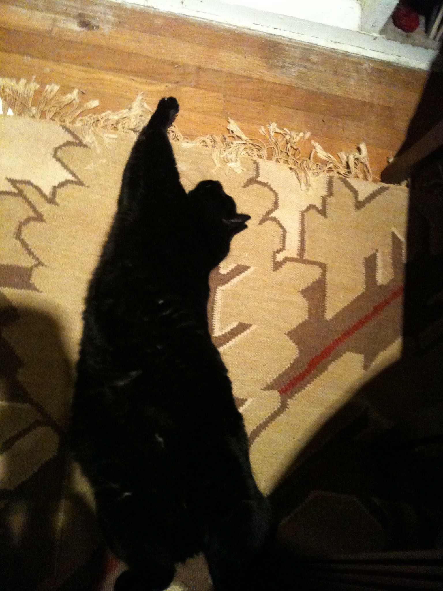 Black cat, almost looking like a shadow on the floor, stretches out on its side.