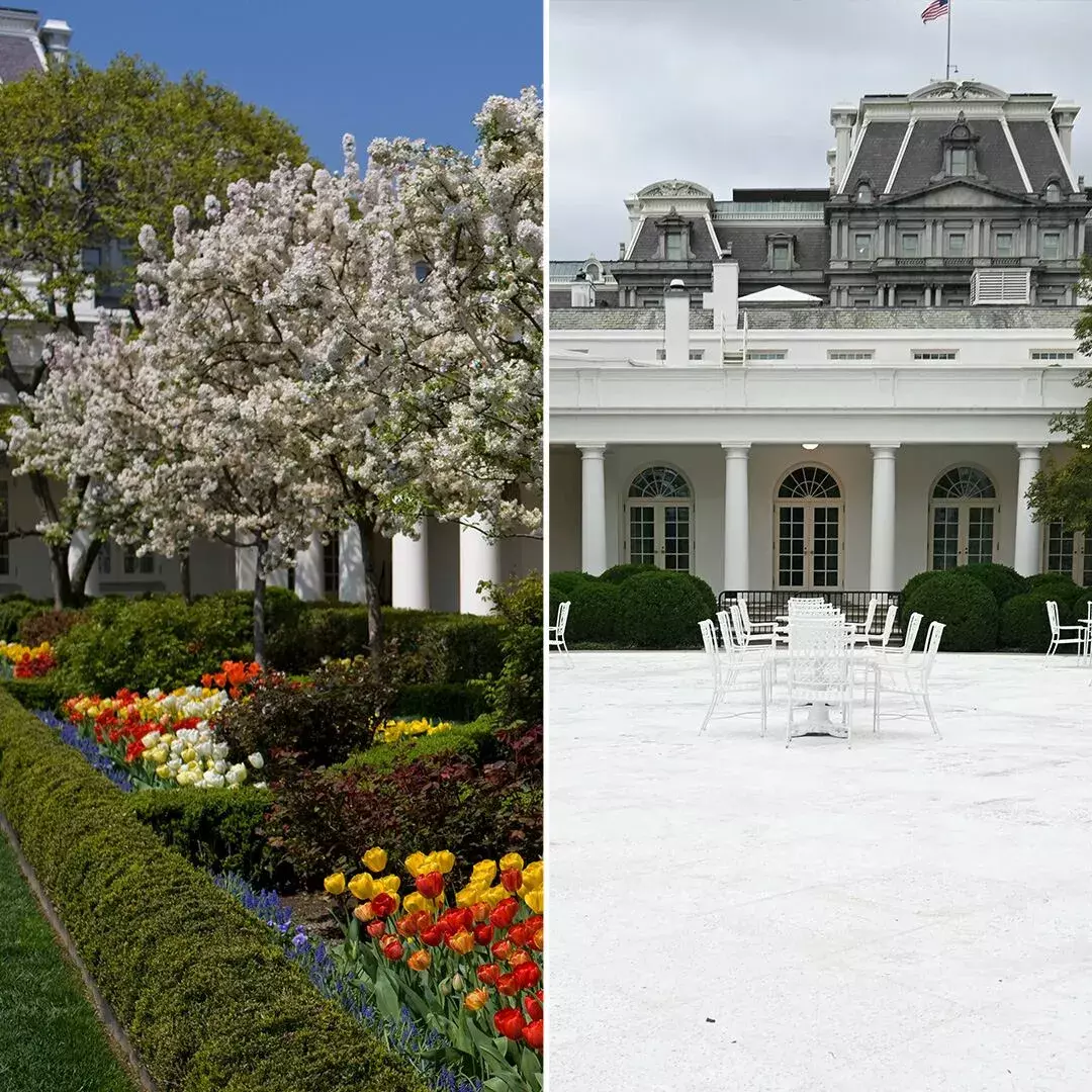 A photo of the rose garden at the White House before Trump paved it over and afterwards, featured by Lucian K. Truscott in a posting today