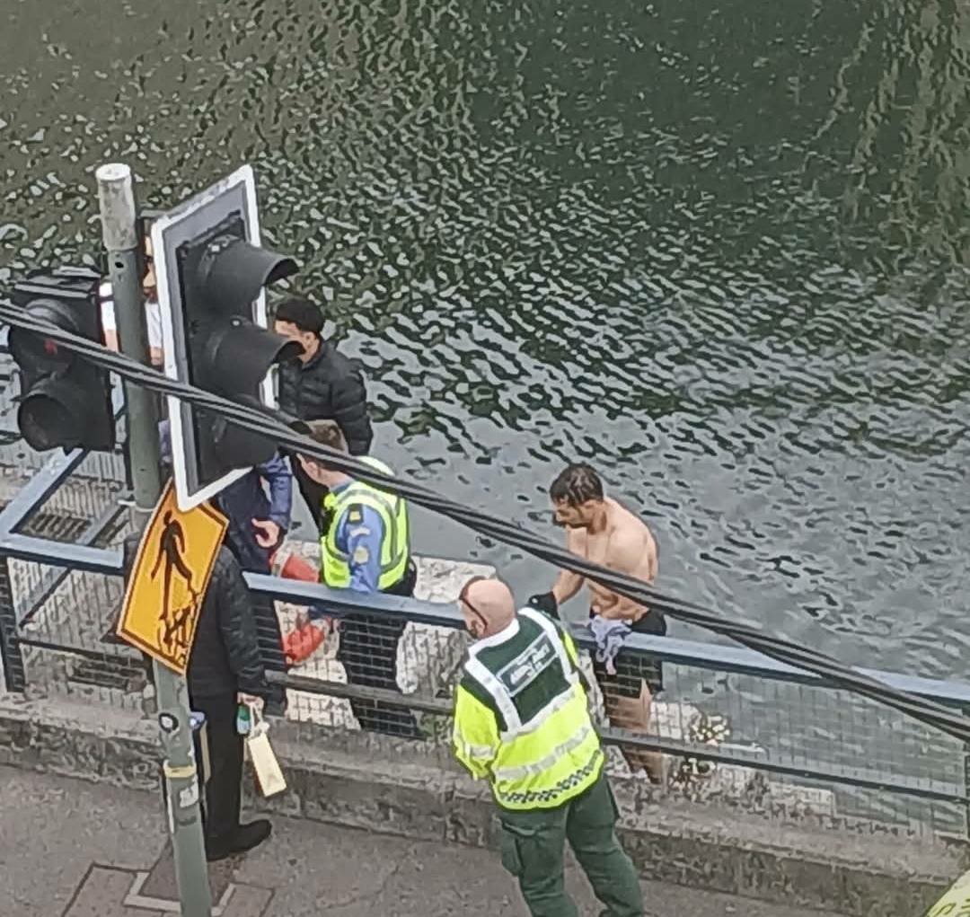 Photo showing a shirtless Muhammad - a Moroccan immigrant in Cork City, Ireland, being helped out of the River Lee by local GardaΓ after he jumped in the river to successfully rescue a woman who had fallen in.