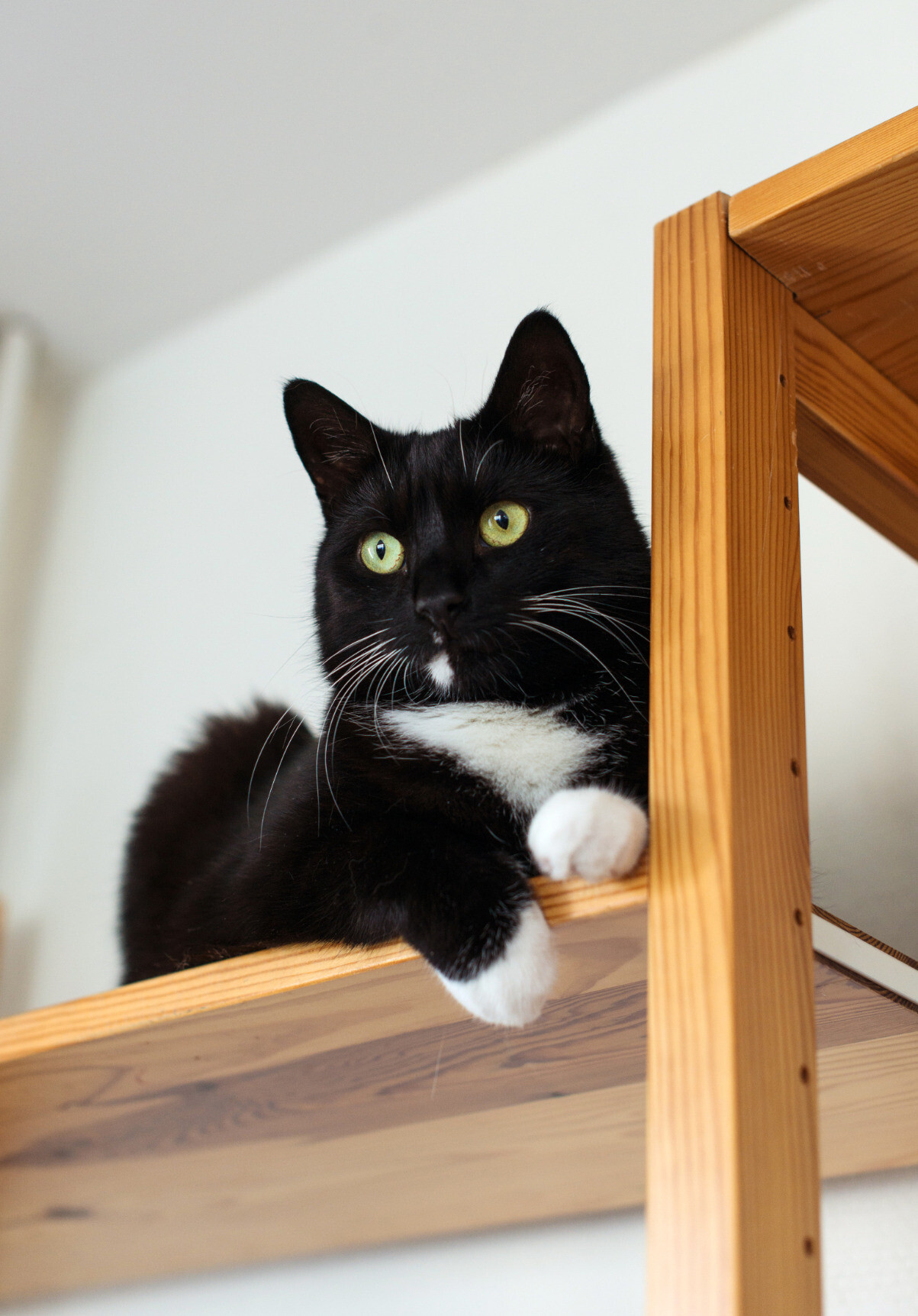 Another photo, flooded with ambient light that makes the mostly black fur of the tuxedo cat, Musti, resting on the same bookshelf look like sumptuous shiny velvet, thick and deep. He has bright yellow green eyes that are wide open and focused on something in the distance. He has a little white cravat, white socks and white whiskers, and a little bit of white on his chin. He has a few white forehead whiskers, which look a little bit like silly eyebrows.