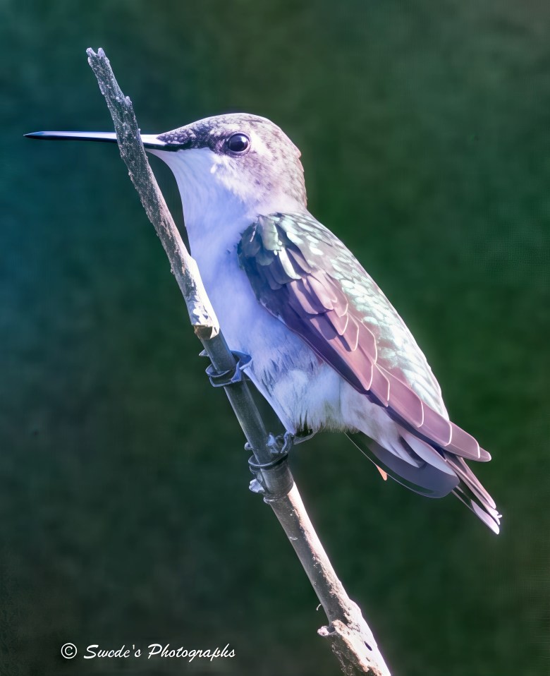 "A female ruby-throated hummingbird (Archilochus colubris) rests delicately on a slender, leafless branch, her tiny body poised with quiet alertness. Her back and wings gleam with iridescent green, like sunlight glancing off fresh spring leaves. Her underside is a clean, soft white, and her throat—unlike the male’s fiery ruby patch—is pale and unadorned, lending her a more understated elegance. Her long, slender beak points forward, a precise instrument evolved for sipping nectar from deep blossoms. Though she is still, there’s a sense of latent energy in her posture, as if she might lift off at any moment in a blur of wings. The background is a gentle blur of green and blue, like a watercolor wash behind glass, creating a serene canvas that lets the hummingbird shine in sharp relief. The soft gradient suggests a lush, natural setting—perhaps a garden or forest edge—without pulling focus from the bird herself. This quiet moment captures the hummingbird in rare repose, a creature more often seen darting and hovering midair. The image is signed “© Swede’s Photographs” in the lower left corner, a subtle signature that respects the tranquility of the scene." - Copilot with edits