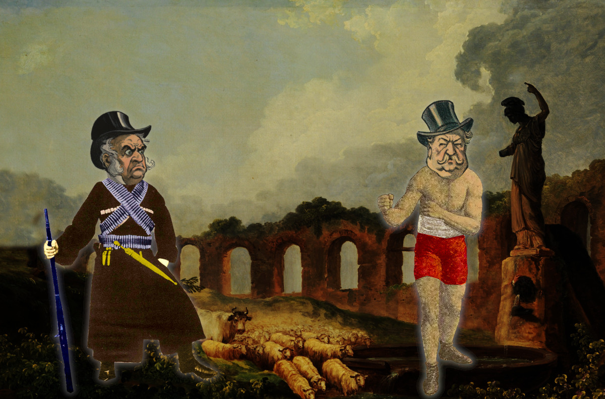 A Roman ruin. In the foreground are two figures: a guerrilla fighter with a rifle and crossed bandoliers and a boxer in trunks and sash, fists raised. Both figures' heads have been replaced with tophatted caricatures of millionaires from Gilded Age editorial cartoons.