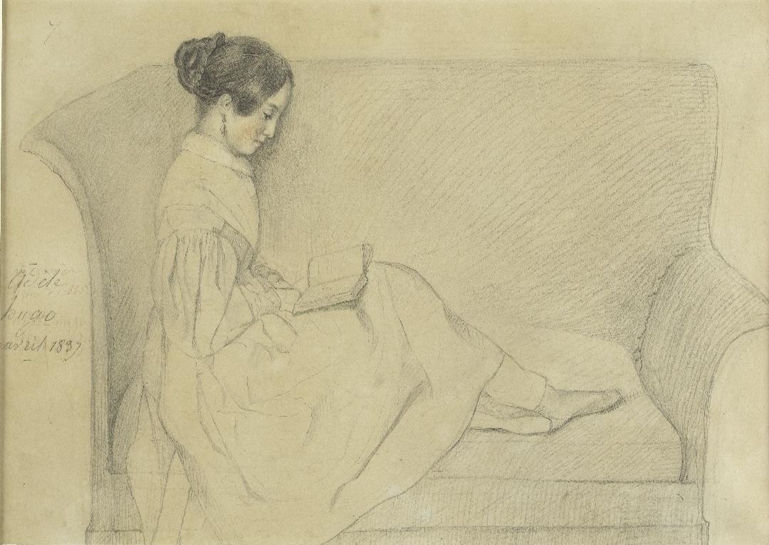 'Léopoldine lisant', Portrait par sa mère Adèle Foucher À gauche «à mon cher Victor, Adèle Hugo, avril 1837». Maison de Victor Hugo, Paris .