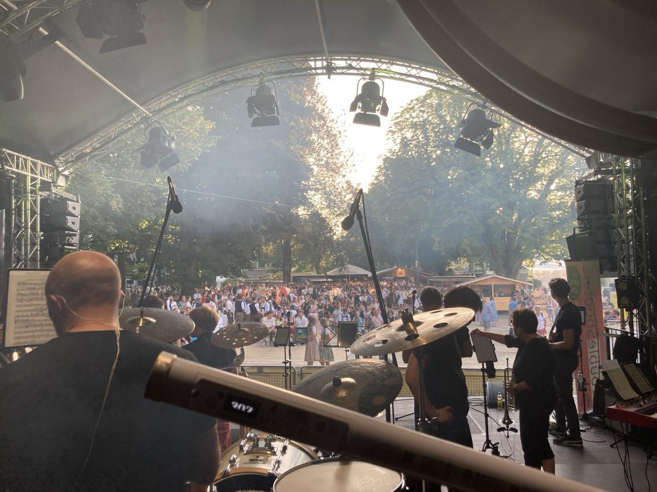 Blick von der groรen Bรผhne ueber einen groรen Platz, mit der Sonne im Hintergrund