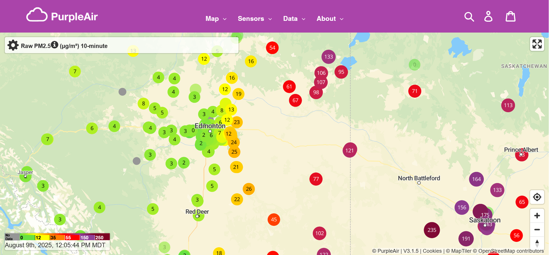 Screenshot of the Purple Air real time map of Raw PM2.5 levels, showing central Alberta and parts of Saskatchewan, at 12:05 MDT. Most of the Edmonton area is covered in bright green data point dots, with readings under 5 micrograms per cubic meter. The eastern edge of the metropolitan area, however, transitions to yellow and orange (readings in the 20s). Data points are less frequent outside the city, but as we continue east they switch to red, purple, and maroon brown, with correspondingly higher readings. Some stations near Saskatoon have particulate levels around 200 micrograms per meter cubed.