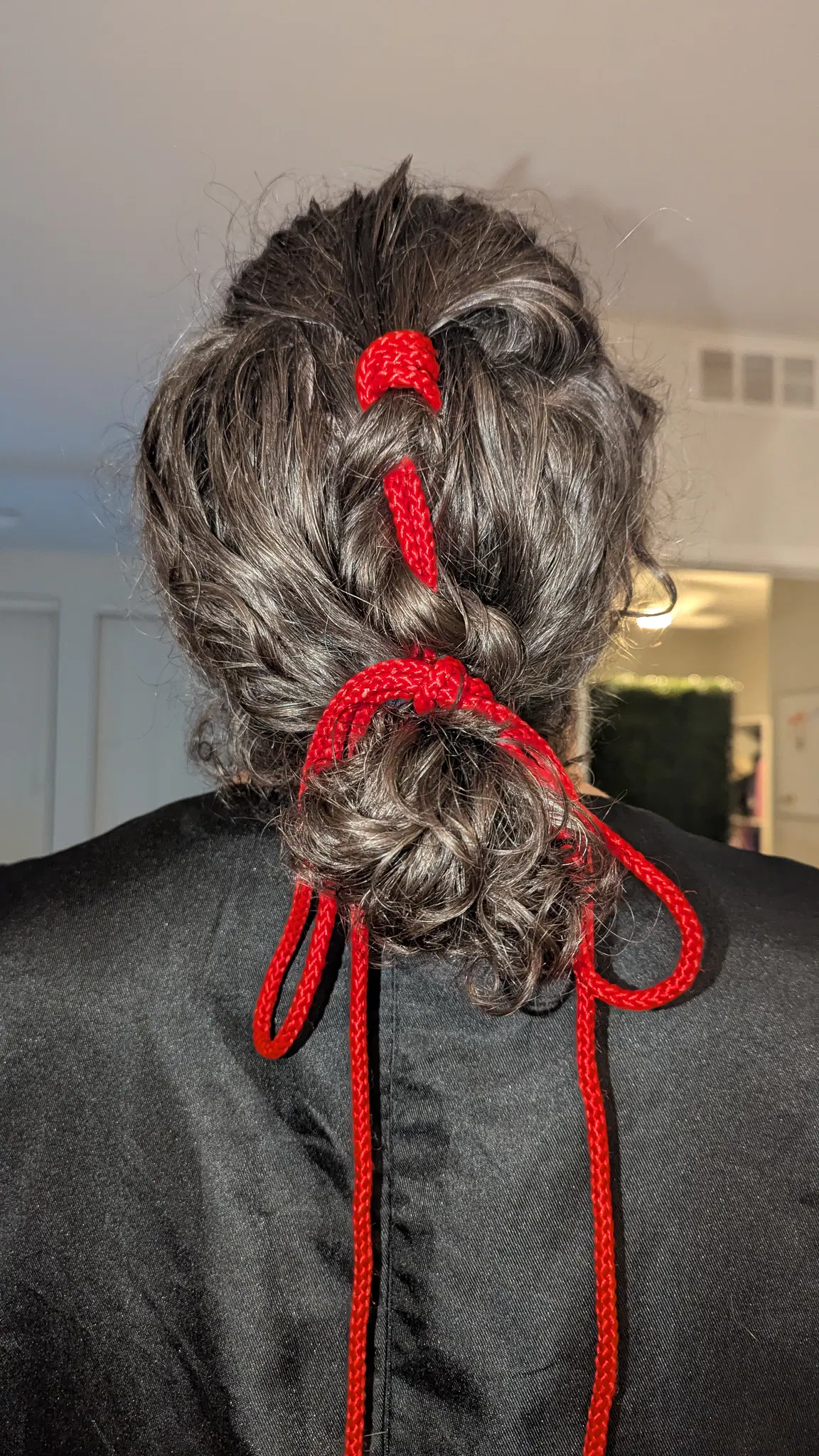 Long hair tied into a bun using a short cotton rope.