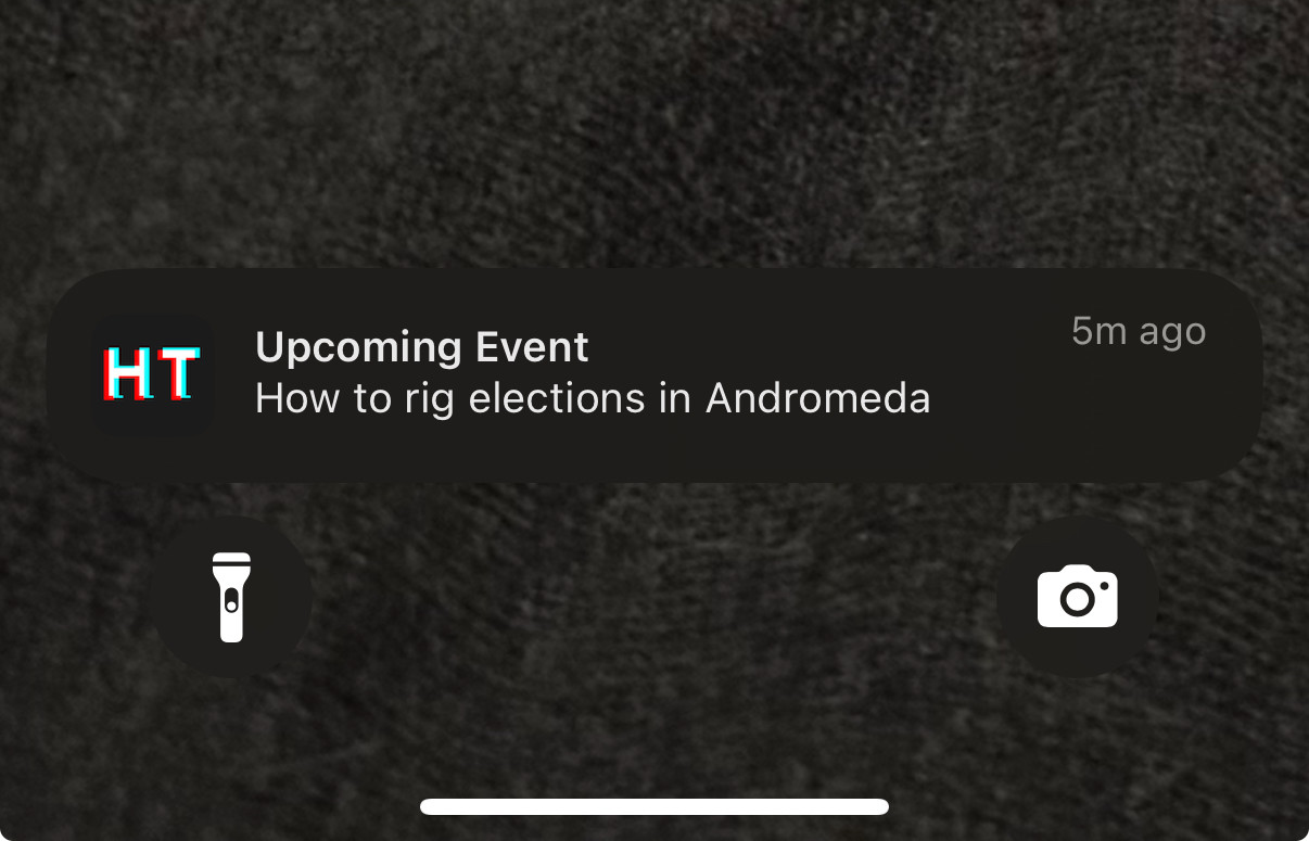 An iOS notification from HackerTracker which reads βHow to rig elections in Andromedaβ