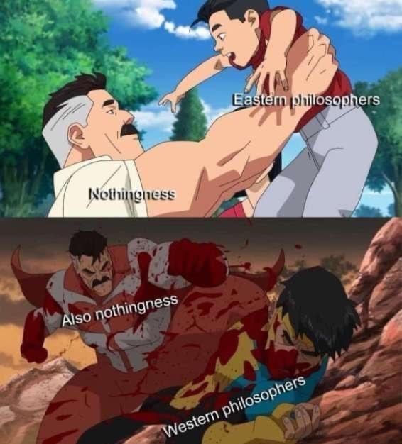 Top cell: Invincible's dad with "nothingness" superimposed over him playing lovingly with his young child with "eastern philosophers" superimposed over him. Bottom cell: Invincible's dad with "also nothingness" superimposed over him beating adolescent invincible with "western philosophers" superimposed over him