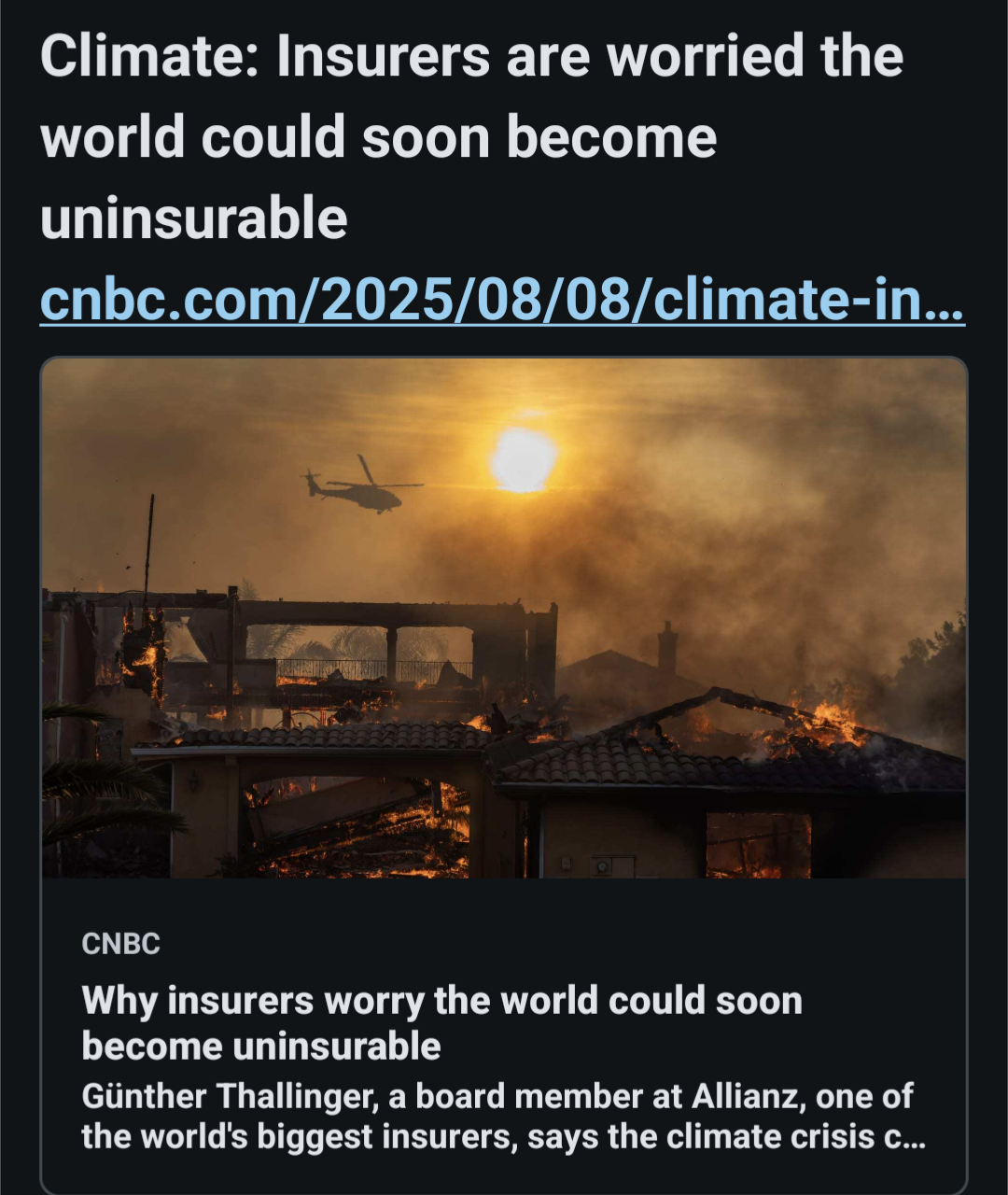 A social media post, cropped. Text: Climate: Insurers are worried the world could soon become uninsurable (link to CNBC) An image of fire and destruction, homes burning, the sun blotted out by smoke. A cyber truck looking like it normally does, engulfed in flames, a helicopter going somewhere far away More text: Why insurers worry the world could soon become uninsurable GΓΌnther Thallinger, a board member at Allianz, one of the world's biggest insurers, says the climate crisis c..