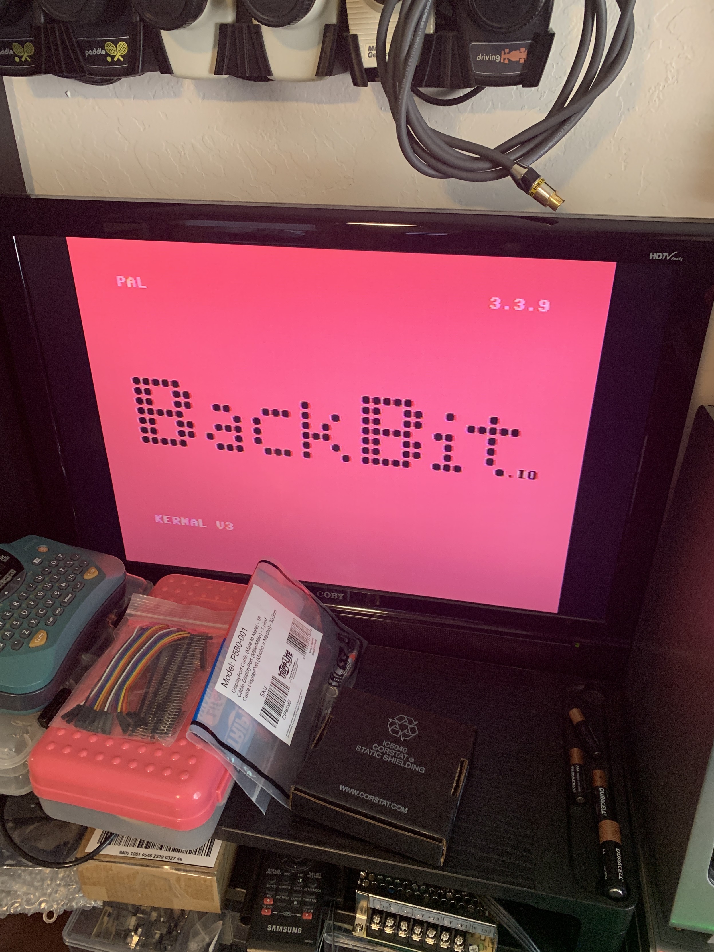 Commodore 64 output after a PAL conversion. Red screen from a Back it cartridge showing that it detects PAL correctly.