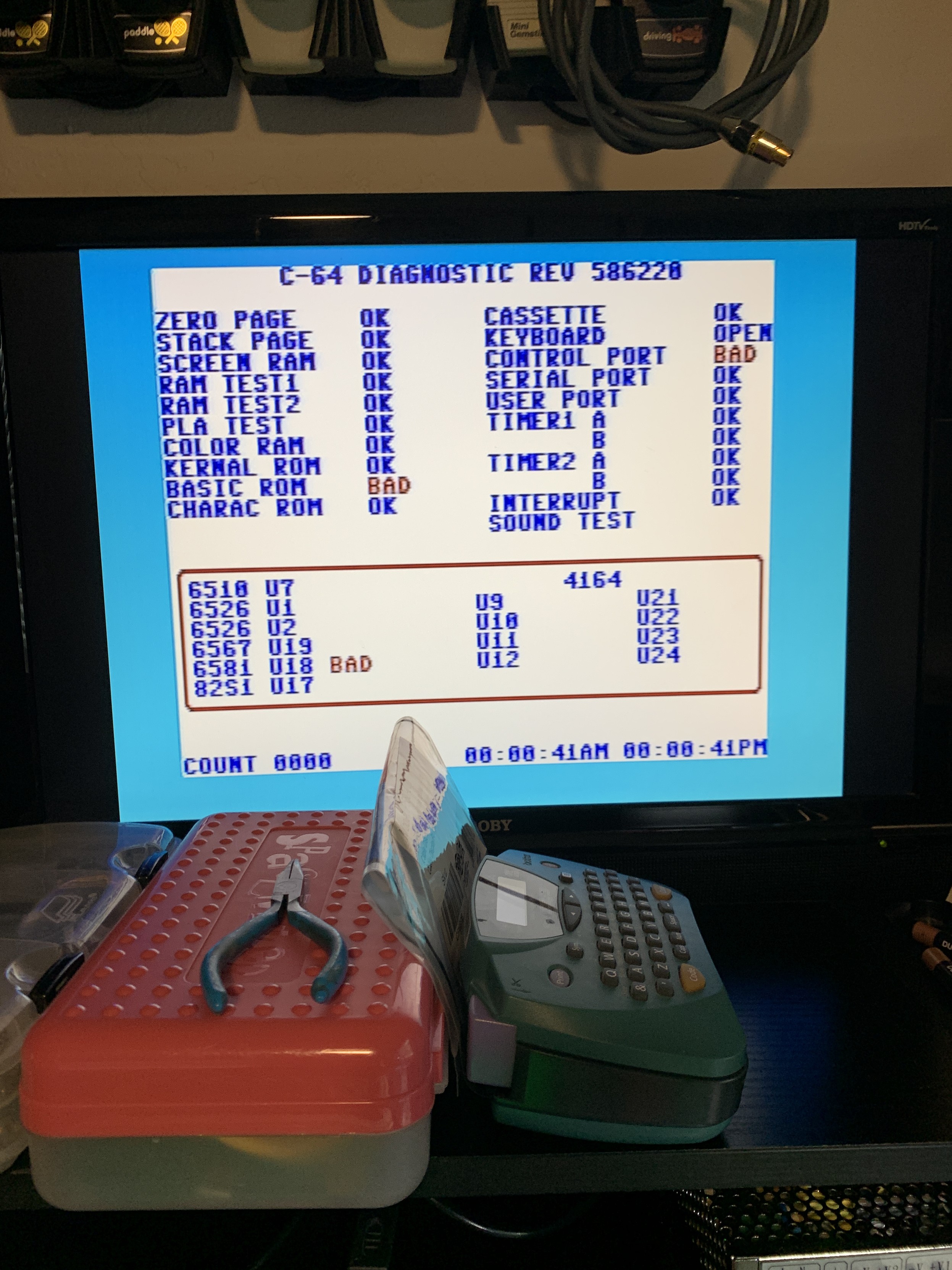 Commodore64 diagnostic output showing the BASIC ROM failing. The control port test is failing as well as not having any audio output.