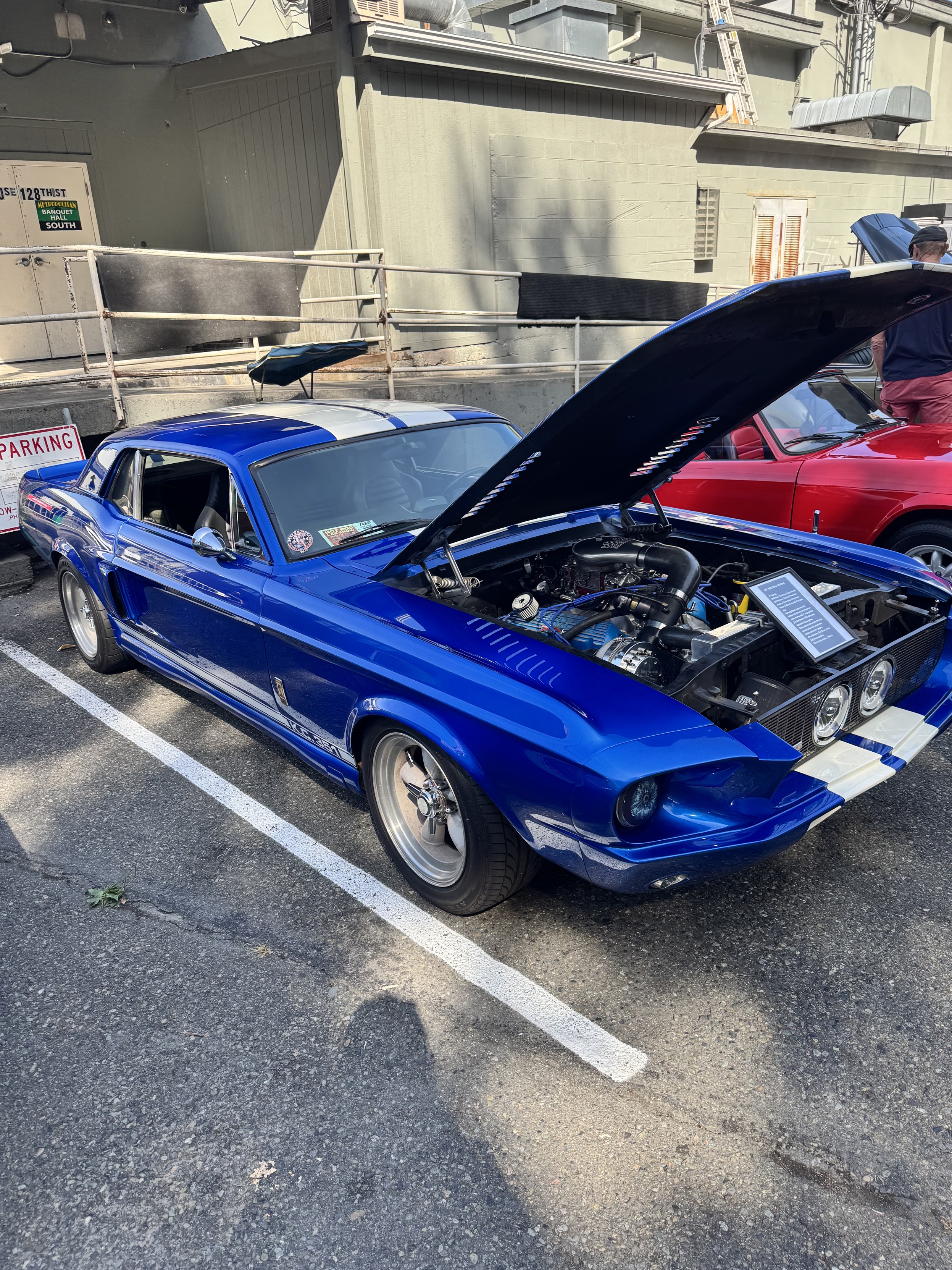 Blue late 60s Mustang, restored Cobra build.