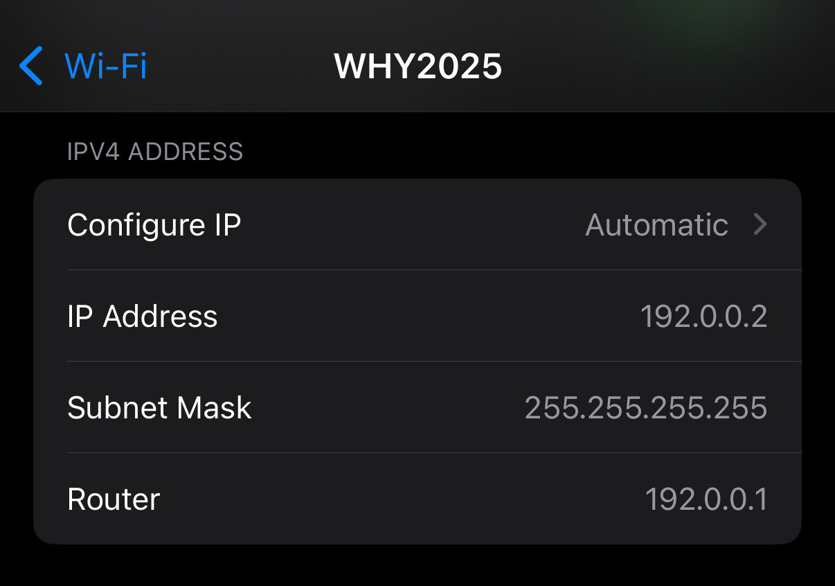 Screenshot of the iOS WiFi settings pane for the WHY2025 SSID. It shows the IP as 192.0.0.2 and Router as 192.0.0.1 indicating a CLAT is in use and the network is IPv6-mostly.