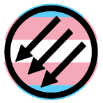 A popular antifascist (antifa) symbol, the three arrows representing the Iron Front, pointing down and left. This in a circle where the outside is black, the trans flag as a background. Image Source (no other info follows): https://cascadiabioregion.org/department-of-bioregion/mls-withdraws-prohibition-of-anti-fascist-iron-front-symbol-in-victory-for-cascadia-supporter-groups