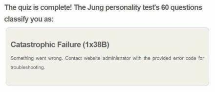 βThe quiz is complete! The Jung personality test's 60 questions classify you as: Catastrophic Failure (1x38B) Something wen wrong. Contact website administrator with the provided error code for troubleshooting