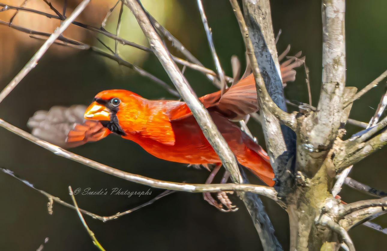 "A Northern Cardinal (Cardinalis cardinalis) bursts through a tangle of tree limbs, its wings flared in mid-flight like a crimson flame leaping through the forest. The bird’s vivid red plumage glows against the muted browns and grays of the blurred background, drawing the eye instantly to its form. Its beak is open—perhaps mid-call, mid-song, or mid-breath—adding a sense of urgency and life to the moment. The wings are caught in motion, each feather splayed with precision, revealing the delicate architecture of flight. The surrounding branches frame the cardinal without confining it, suggesting both the complexity of its environment and the freedom of its movement. The image feels like a heartbeat—brief, bold, and beautiful. In the lower left corner, the watermark “© Swede's Photographs” quietly acknowledges the artist’s hand behind the lens." - Copilot