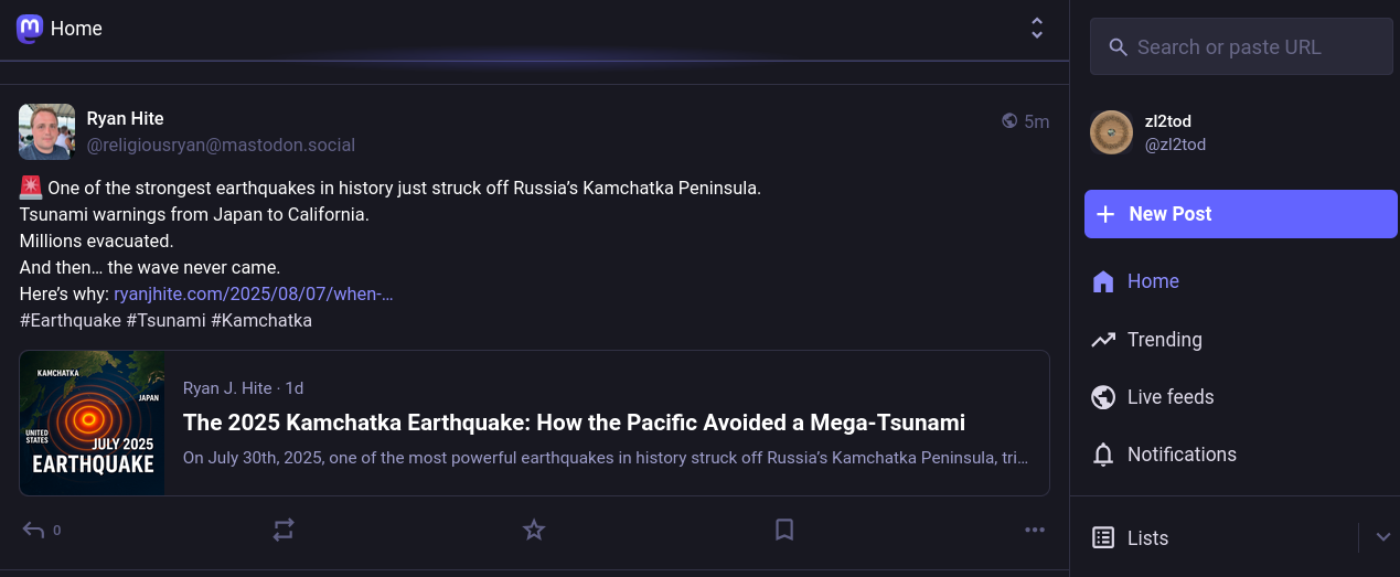 Ryan Hite @religiousryan@mastodon.social 🚨 One of the strongest earthquakes in history just struck off Russia’s Kamchatka Peninsula. Tsunami warnings from Japan to California. Millions evacuated. And then… the wave never came. Here’s why: https://www.ryanjhite.com/2025/08/07/when-the-pacific-shook-the-2025-kamchatka-earthquake-and-the-tsunami-that-almost-was/ #Earthquake #Tsunami #Kamchatka Ryan J. Hite · 1d The 2025 Kamchatka Earthquake: How the Pacific Avoided a Mega-Tsunami On July 30th, 2025, one of the most powerful earthquakes in history struck off Russia’s Kamchatka Peninsula, triggering tsunami warnings across the Pacific. From Japan’s mass evacuations to U.S. coastal alerts, here’s how millions braced for disaster — and why the worst never came. Aug 10, 2025, 09:56 AM · https://mastodon.social/@religiousryan/115001037762091826