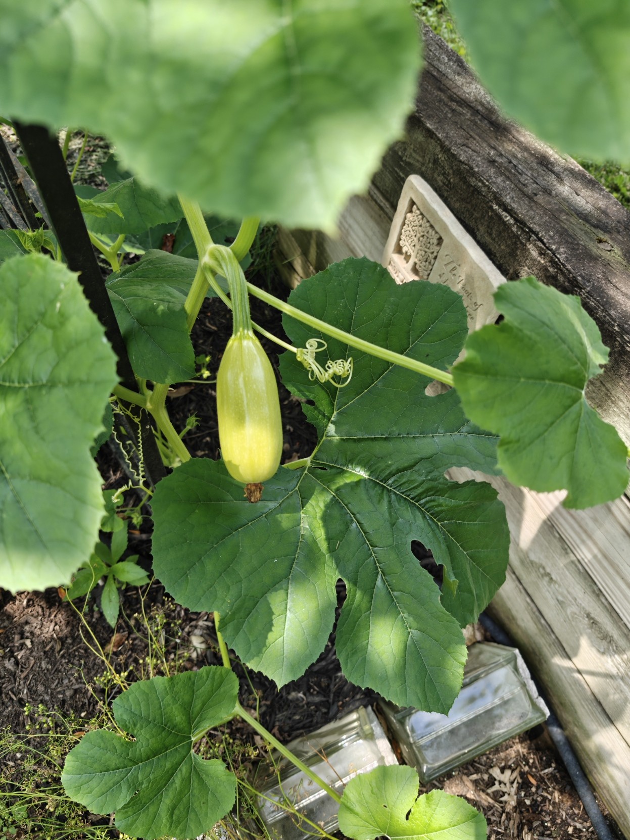 Hey spaghetti squash hanging from a trellis