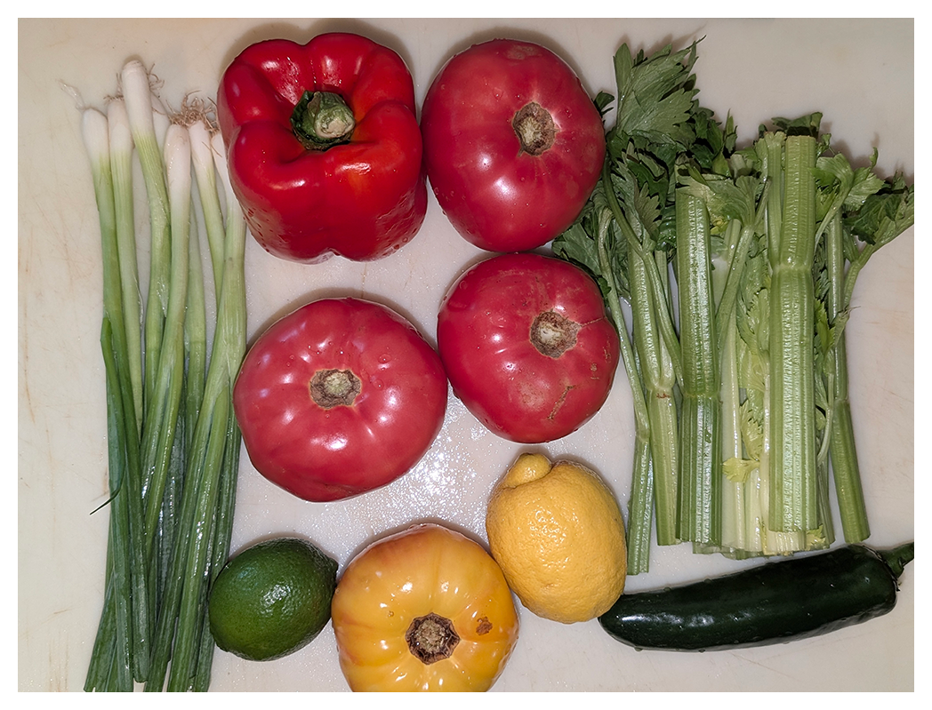 flash. overhead view of fresh-washed veg on a white cutting board: spring onions, red bell pepper, tomatoes, lemon and lime, celery and a jalapeno pepper.